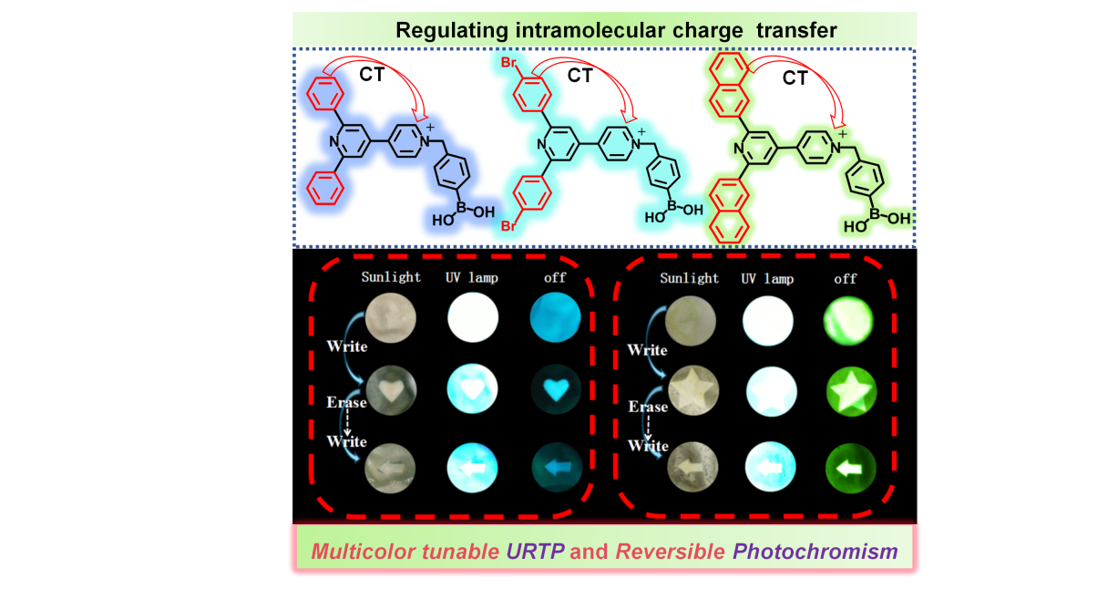 動態(tài)光致變色長壽命室溫磷光材料是一類兼具結構色變化與發(fā)光特性可調(diào)(強度、壽命及顏色)的智能光學材料,在高級防偽、信息加密、傳感等領域具有巨大應用潛能。然而,如何將光致變色和長壽命室溫磷光功能有效整合到單一聚合物體系,以構筑出多色可調(diào)的高性能的動態(tài)光致變色長壽命室溫磷光聚合物,仍面臨巨大挑戰(zhàn)。我們研究團隊策略性地將具有可調(diào)控分子內(nèi)電荷轉(zhuǎn)移(ICT)能力的非線性吡啶鎓單元嵌入剛性聚乙烯醇(PVA)基質(zhì)中,成功地開發(fā)了多色可調(diào)的動態(tài)光致變色長壽命室溫磷光聚合物。