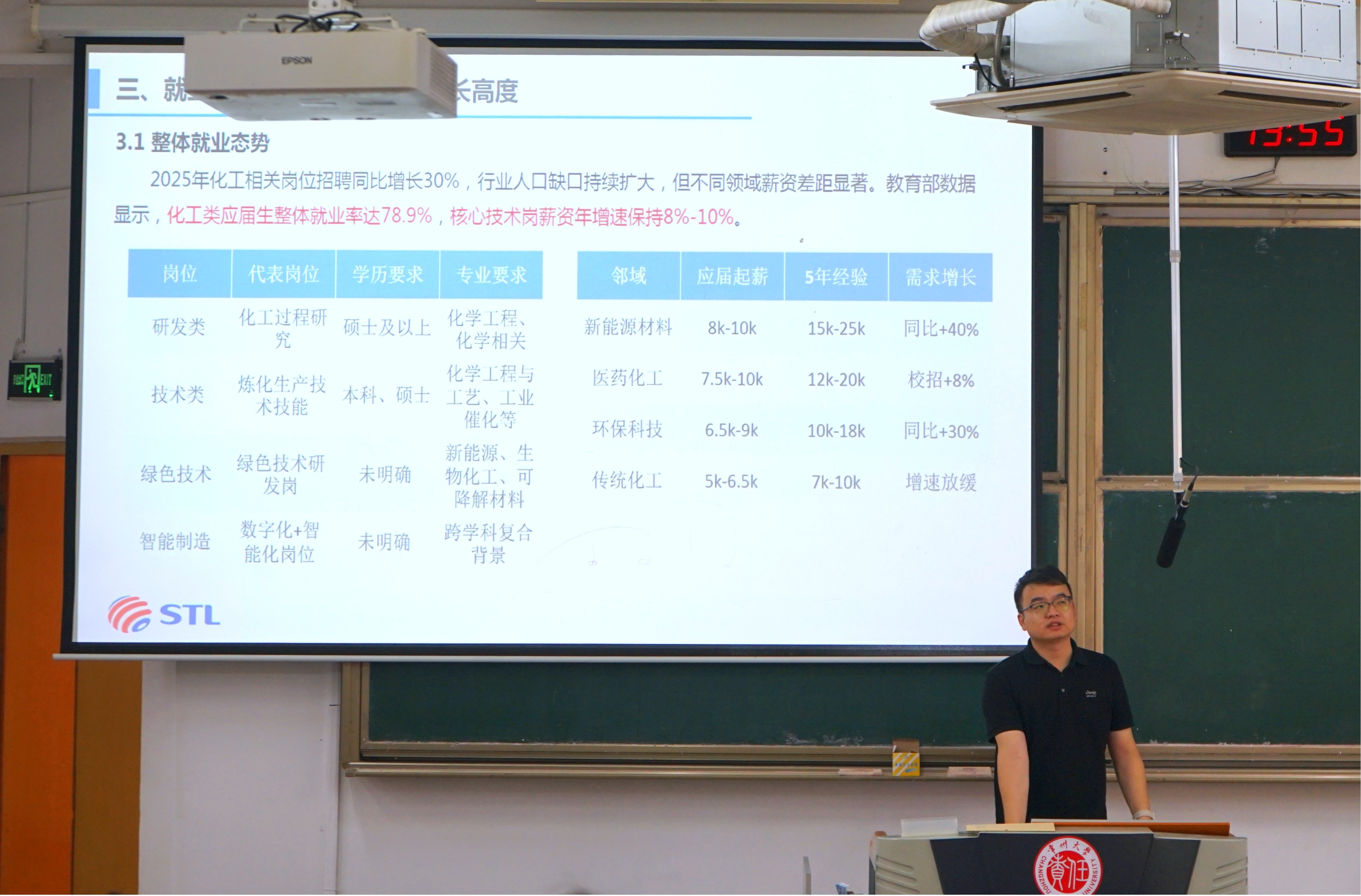 本次講座圍繞石化企業(yè)的招聘要求、行業(yè)發(fā)展現(xiàn)狀、職業(yè)發(fā)展建議等方面展開。三位校友首先為同學(xué)們解析了當(dāng)前石化行業(yè)的招聘趨勢(shì)、招聘流程和具體要求,并結(jié)合他們所在企業(yè)和相關(guān)領(lǐng)域的詳實(shí)產(chǎn)業(yè)數(shù)據(jù),深入剖析了化工相關(guān)產(chǎn)業(yè)的發(fā)展現(xiàn)狀。此外,校友們結(jié)合他們的求學(xué)和工作經(jīng)歷,給學(xué)弟學(xué)妹們分析了化工相關(guān)專業(yè)的就業(yè)現(xiàn)狀和職業(yè)發(fā)展前景,幫助同學(xué)們厘清發(fā)展路徑、做好職業(yè)規(guī)劃。最后,他們寄語(yǔ)學(xué)弟學(xué)妹們要筑牢專業(yè)知識(shí)基礎(chǔ),務(wù)必學(xué)好專業(yè)課程;要拓展視野,鼓勵(lì)大家積極參與科研項(xiàng)目、學(xué)科競(jìng)賽和社會(huì)實(shí)踐,提升解決復(fù)雜問(wèn)題的綜合能力;還要錘煉品格,培養(yǎng)吃苦耐勞、勇于擔(dān)當(dāng)?shù)穆殬I(yè)精神,并保持終身學(xué)習(xí)的習(xí)慣,以應(yīng)對(duì)行業(yè)的快速變革。他們的寄語(yǔ)情真意切,引發(fā)了在場(chǎng)同學(xué)的深深共鳴。