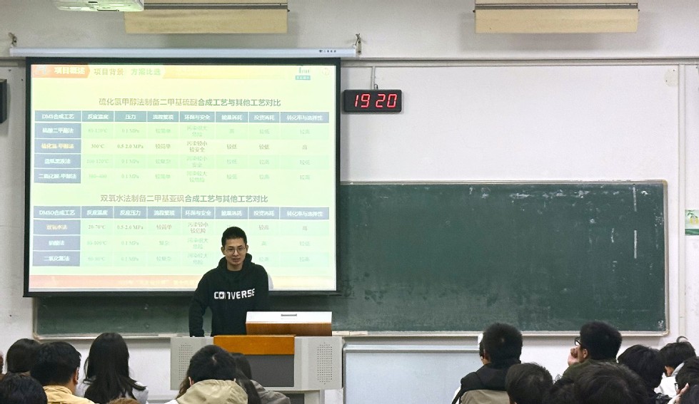 為幫助同學(xué)們拓寬專業(yè)視野、提升專業(yè)實踐能力,11月11日晚,“石化青年說”系列講座第二講在W1207教室順利舉行,講座由化工224班常佩源與化工226班張皓博兩位同學(xué)擔(dān)任主講。他們所在的常州大學(xué)“砜硫隊”,曾憑借“福建凱美特氣體有限公司分公司年產(chǎn)1.5萬噸二甲基亞砜項目”的出色設(shè)計,在2025年“天正設(shè)計杯”第十九屆全國大學(xué)生化工設(shè)計競賽中脫穎而出,斬獲全國特等獎。