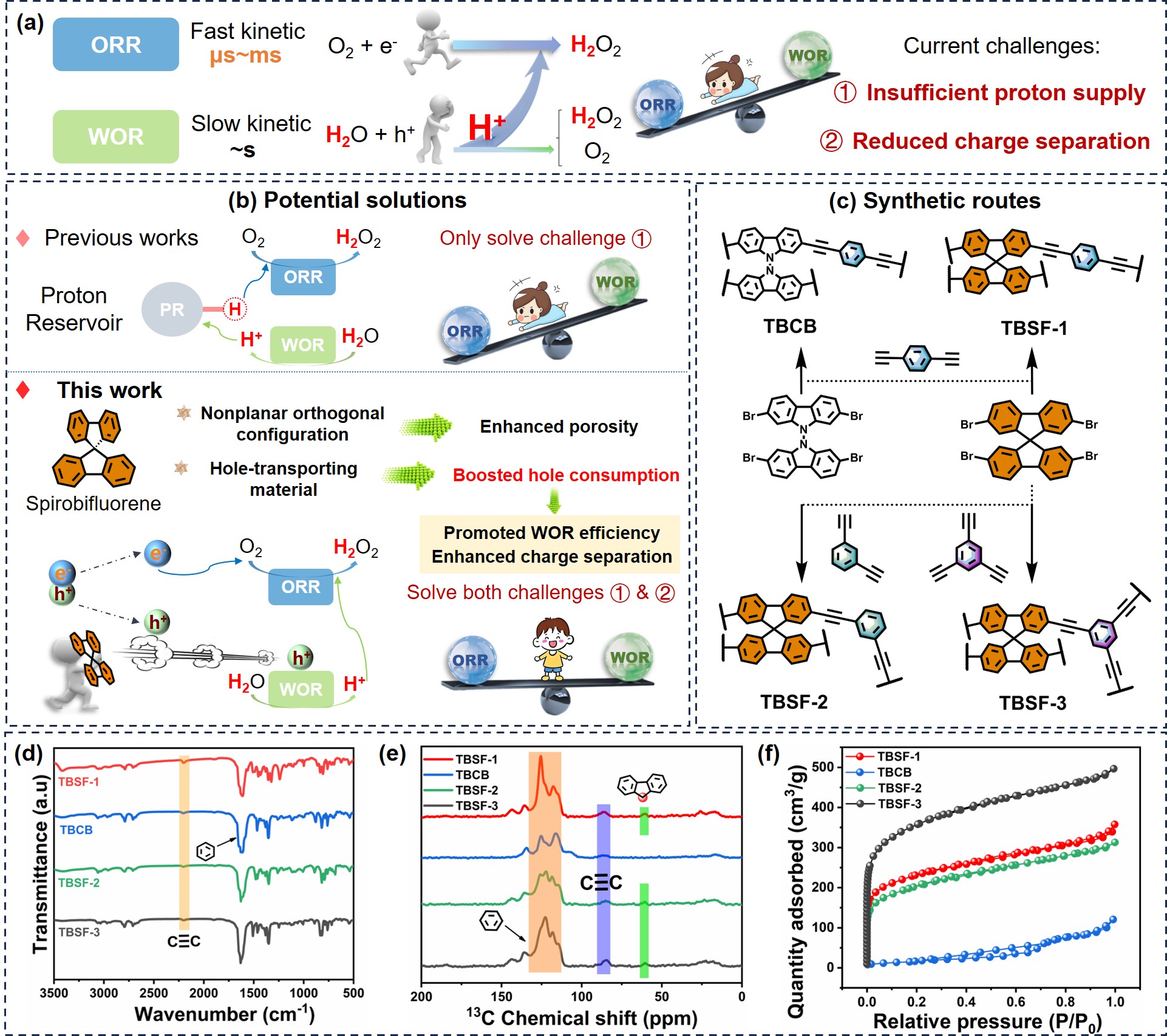 (2)針對質子供應有限的問題,我們在之前的工作中(Chem, Sci.2025, 16, 8577-8587)提出“質子海綿”的概念,直接給氧還原反應(ORR)供質子,來解決“質子悖論”問題。但該策略并未有效抑制光生載流子的復合和提高電荷傳輸能力。為此,我們提出直接提高水氧化反應(WOR)性能的策略,以螺二芴分子為構筑單元合成COPs催化劑(圖2)。螺二芴具有正交的空間構型,是高效的空穴傳輸材料,基于其的COPs具有諸多優(yōu)點,例如WOR性能大幅度提高以產(chǎn)生更多質子,滿足ORR較快的動力學需求;加速空穴消耗,抑制載流子復合;獨特的正交電荷傳輸通道更是加速了電荷的傳輸。因此,這類COPs催化劑在純水和空氣中的產(chǎn)H2O2速率達到9.29 mmol g-1 h-1,在氮氣氛圍中也能達到3.28 mmol g-1 h-1。該工作以Orthogonal Configurative Spirobifluorene-Based Conjugated Organic Polymers for Enhanced Water Oxidation Reaction to Boost H2O2 Photosynthesis為題,發(fā)表在材料學領域頂級期刊Adv. Funct. Mater.2025, e18050。