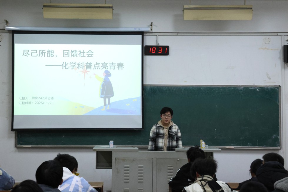 我院于11月25日在W1205教室成功舉辦了“石化青年說”系列講座第三講。本次講座以“盡己所能,回饋社會”為主題,由能化242班孫志臻與化工246班宋羽凡擔(dān)任主講。