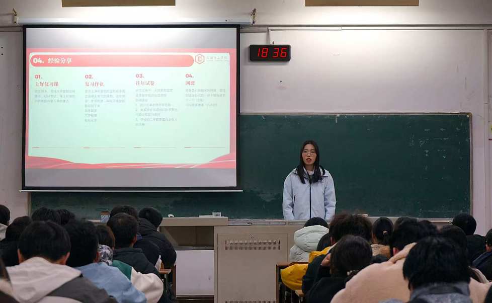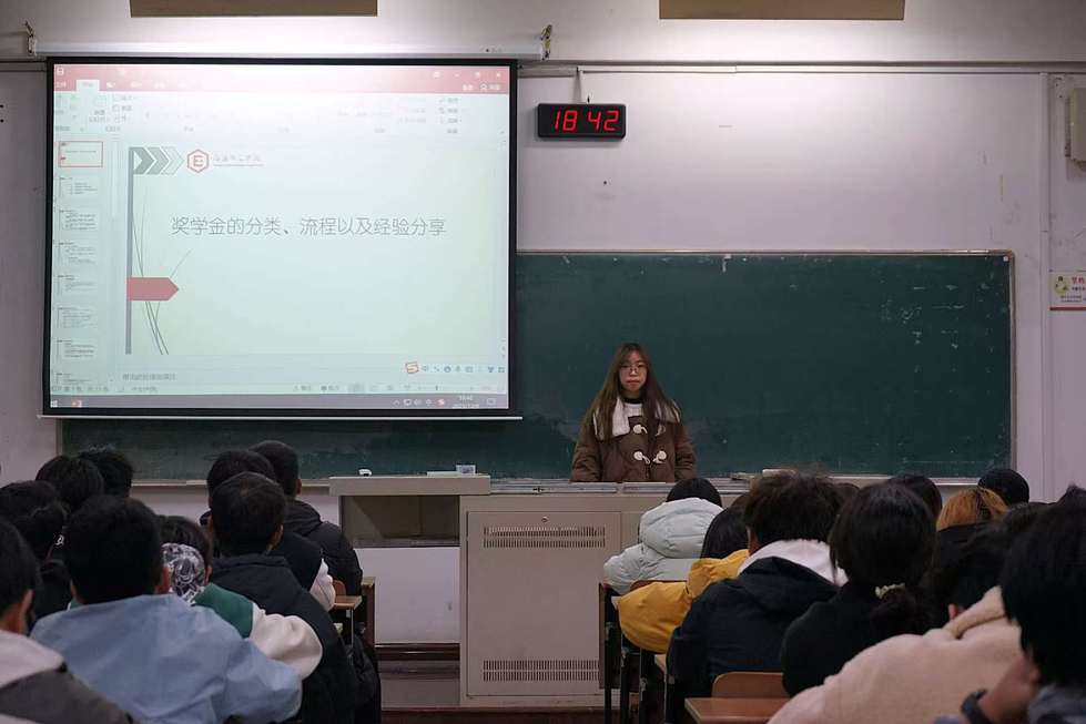 會(huì)上,兩位同學(xué)圍繞獎(jiǎng)學(xué)金類型、學(xué)習(xí)規(guī)劃與綜合素質(zhì)拓展等方面展開分享。她們系統(tǒng)介紹了學(xué)院設(shè)立的各類獎(jiǎng)學(xué)金,并基于自身經(jīng)驗(yàn),強(qiáng)調(diào)了“預(yù)習(xí)-聽課-復(fù)習(xí)”的高效學(xué)習(xí)閉環(huán),以及通過考證、競(jìng)賽、學(xué)生工作與志愿服務(wù)等途徑提升綜合能力的重要性。她們鼓勵(lì)大家勇于嘗試、主動(dòng)爭(zhēng)取。