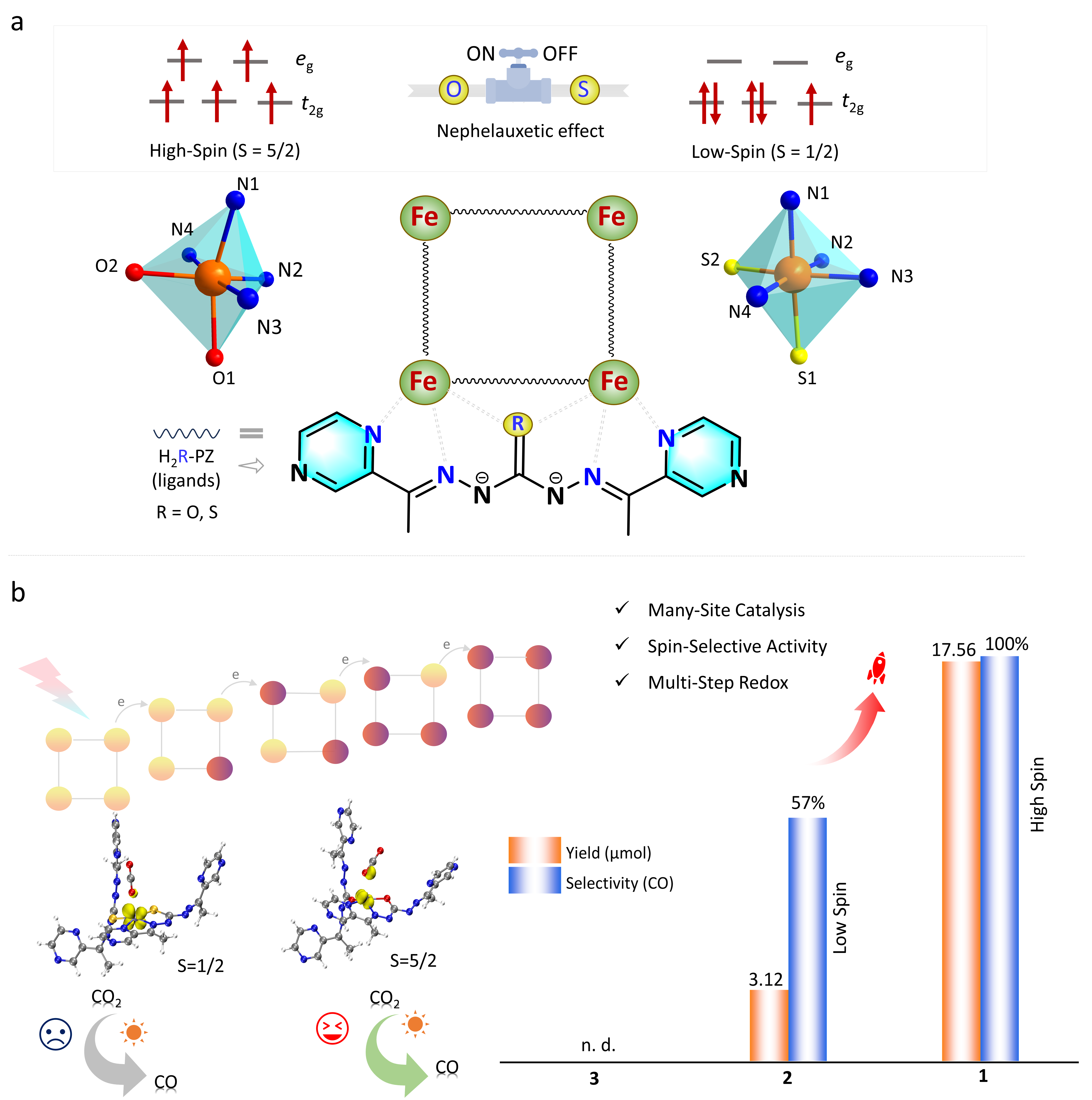 課題組針對(duì)催化中心自旋態(tài)在原子尺度上的精準(zhǔn)調(diào)控難題,提出了一種超分子自組裝新策略:通過構(gòu)建基于π?π堆積的長(zhǎng)程有序結(jié)構(gòu),并巧妙利用配體的Nephelauxetic 效應(yīng),僅通過替換單個(gè)橋原子即實(shí)現(xiàn)了Fe3+中心在高自旋與低自旋態(tài)之間的可控切換,成功制備了自旋態(tài)可調(diào)的Fe4團(tuán)簇超薄納米層(圖2)。研究表明,高自旋態(tài)Fe3+團(tuán)簇具有更優(yōu)異的電子轉(zhuǎn)移能力,可顯著促進(jìn)光生載流子分離與傳輸,在CO2還原反應(yīng)中表現(xiàn)出接近100%的CO選擇性及遠(yuǎn)優(yōu)于低自旋體系的催化活性。理論計(jì)算進(jìn)一步闡明,高自旋態(tài)Fe3+與CO2之間存在更強(qiáng)的軌道相互作用,不僅能增強(qiáng)CO2吸附,還可降低關(guān)鍵中間體形成的吉布斯自由能。該工作不僅為設(shè)計(jì)具有自旋調(diào)控功能的CO2光還原催化劑提供了新穎的超結(jié)構(gòu)模型,也深化了對(duì)自旋態(tài)影響人工光合作用過程機(jī)制的認(rèn)識(shí)。